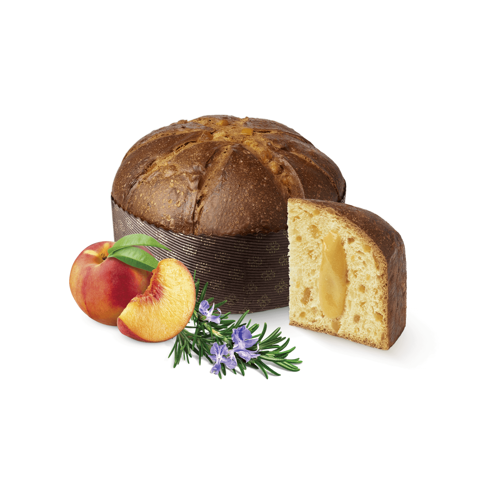 The unique fruity flavour of juicy,semi-candied peaches combines with the intensity of rosemary to give the panettone flavour and freshness. The flavour of rosemary is not revealed at the first bite, but taste after taste through the delicious filling made with peach cream, rosemary notes and Natural Bourbon Vanilla from Madagascar.